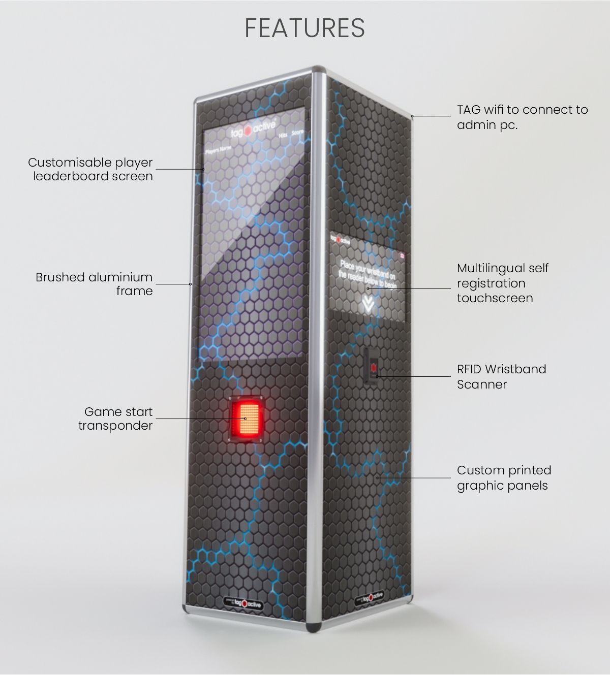 This tower contains a TAG active® server, internal TAG wifi, player registration screen, score screen and game start transponder.